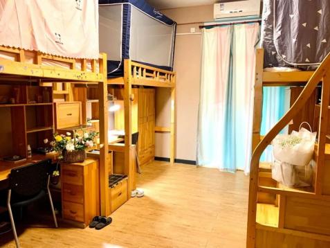 木质家具营造出温馨的氛围,上床下桌搭配大衣柜的组合,让宿舍充满家的气息,空间布局合理,采光极佳且配备空调,学习、储物均十分便捷!