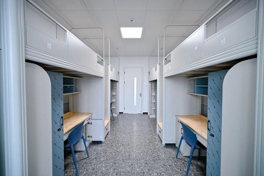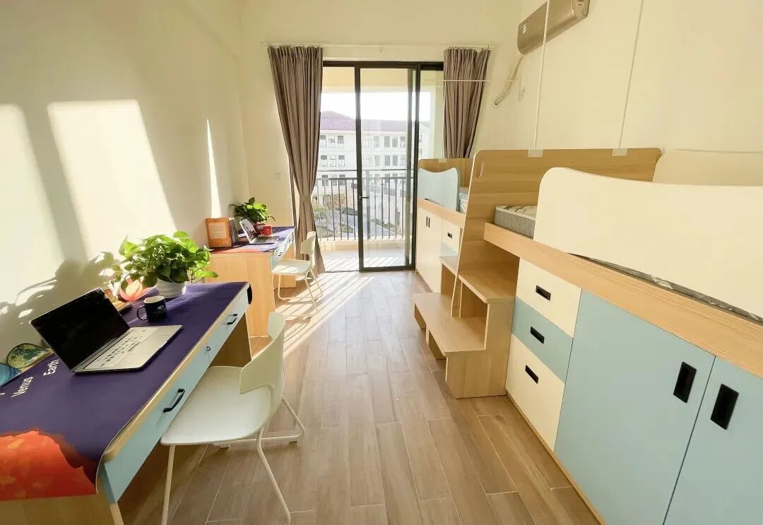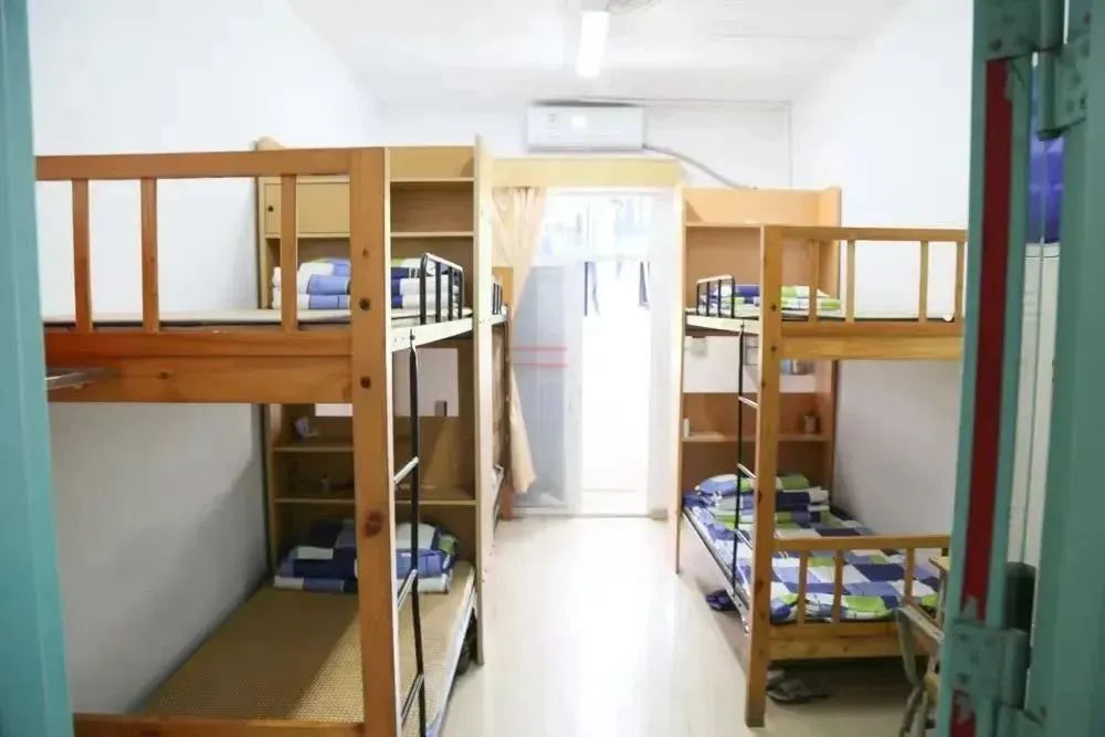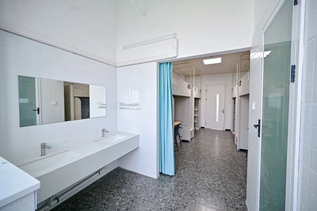 宿舍可容纳4至8人居住,设施完备,所有宿舍楼均配备电梯。每间宿舍均配有床、衣柜等基本家具,并装有空调、独立卫生间及洗漱台,24小时不间断供应冷热水。宿舍外还设有直饮水机、洗衣机、吹风机及公共晾晒区域,并提供衣物烘干服务,全方位保障学子们的住校生活品质。