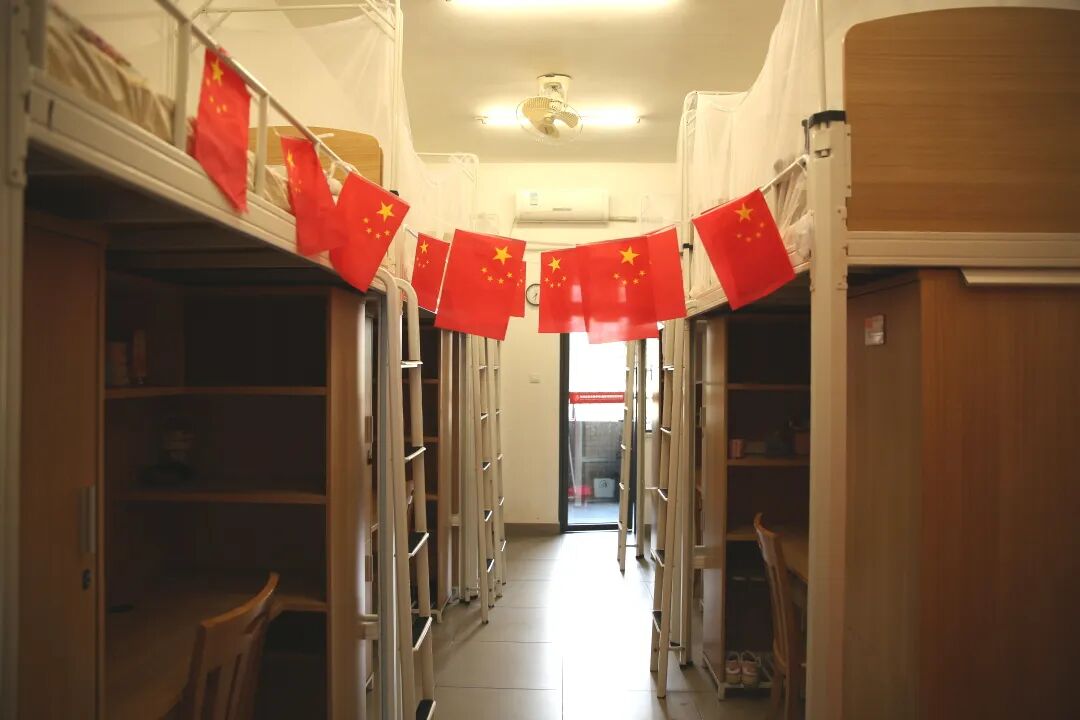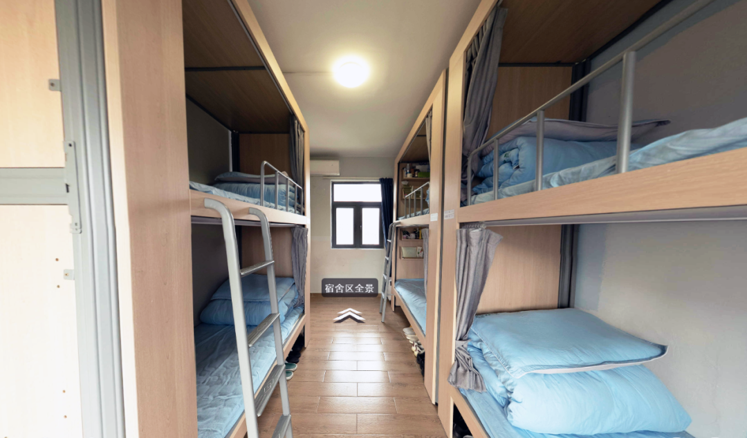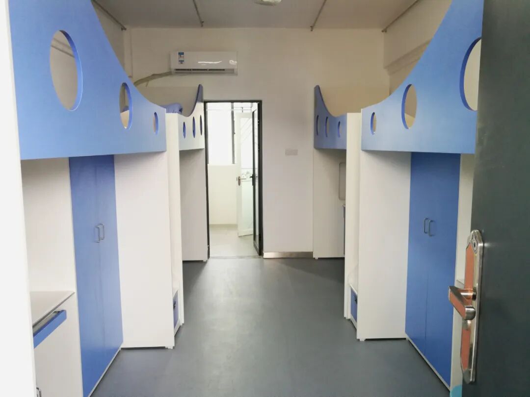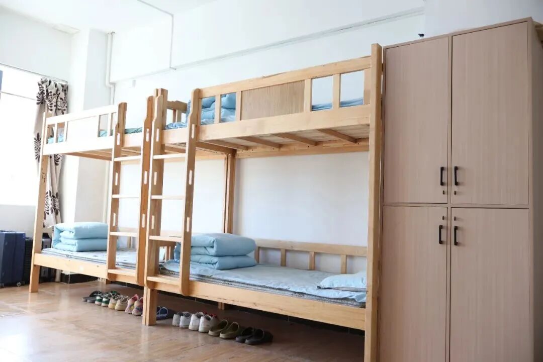 每间宿舍配置6个床位,采用上下铺设计,配备有空调、风扇、书桌、凳子、储物柜、双层铁质木床、冷热水供应系统、窗帘及免费固定电话。走廊墙壁上设有电吹风专用插座。公共区域设施完备,包括消防设备、应急照明系统、电子门禁系统、数字广播系统、冷热饮水机及室外走廊视频监控,全方位确保学生的安全与生活便捷。