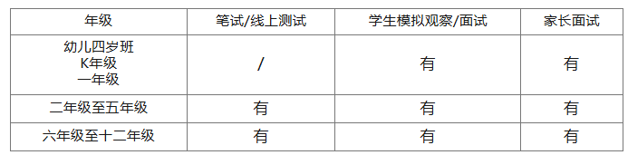 2年级-5年级:孩子需参加笔试(涵盖数学、英语),并进行面试,家长一方同样需参加英文面试。