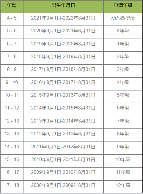 年龄及对应申请年级请参考以下表格: