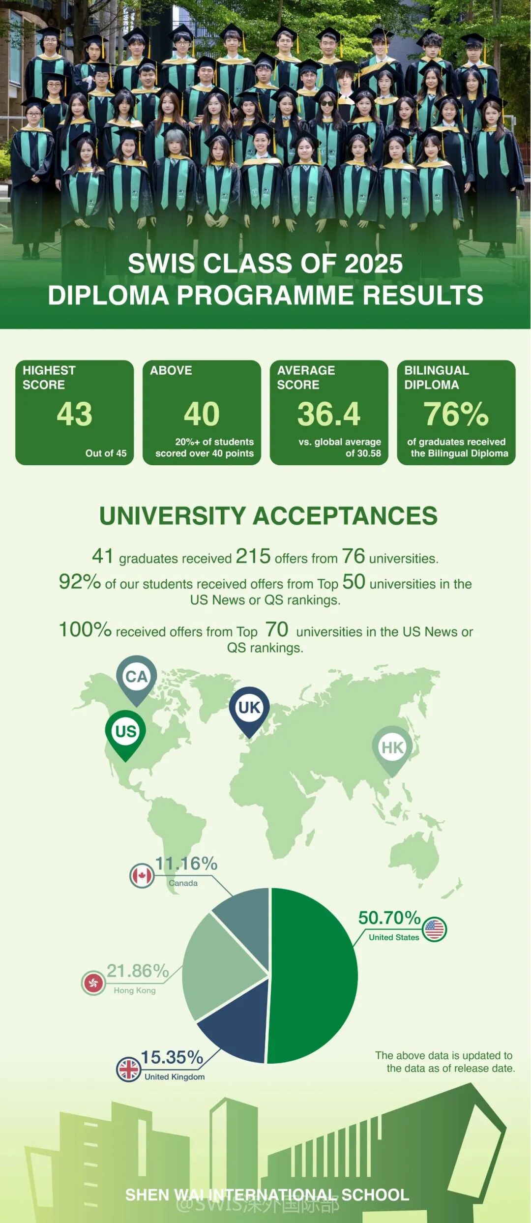 尤为值得一提的是,76%的毕业生成功获得了DP双语文凭,展现了出色的语言能力和跨文化素养。