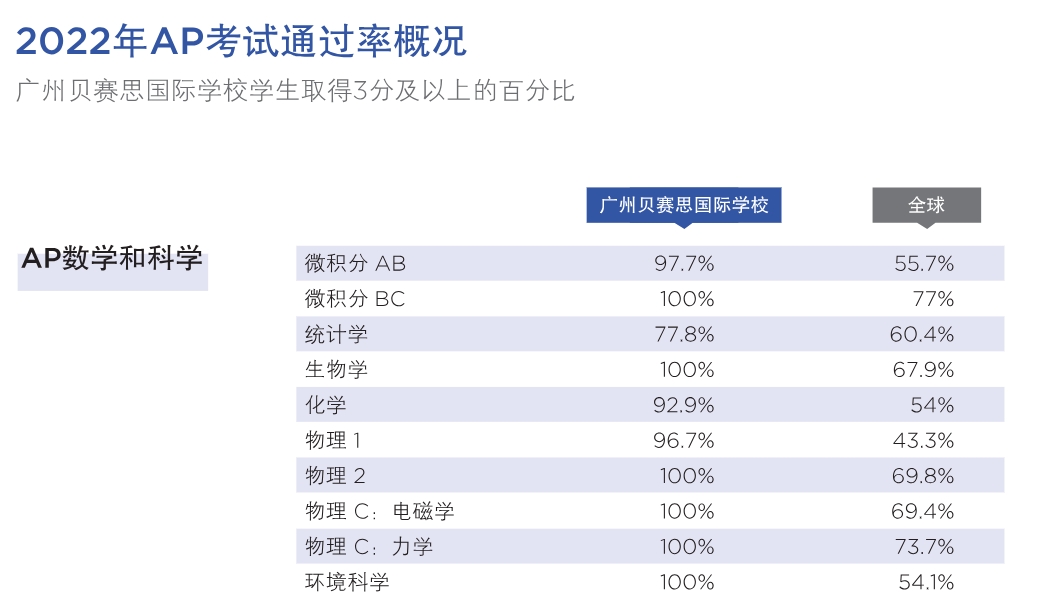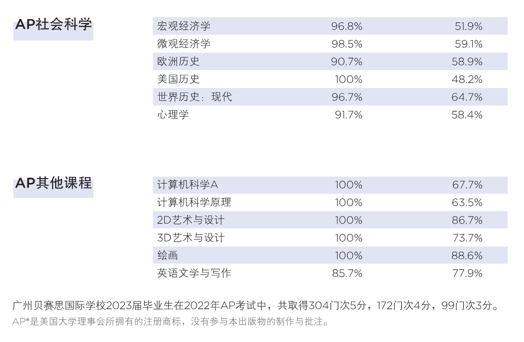 值得一提的是,在申请学术类专业的学生中,65%的学生获得美国排名前30和/或美国文理学院排名前10和/或英国排名前5和/或加拿大排名前2的大学录取。100%的学生获得美国排名前50和/或美国文理学院排名前20和/或英国排名前10和/或加拿大排名前3和/或中国香港排名前3的大学录取。广州贝赛思国际学校不断追求卓越,继续凭借稳定出色的教育质量与学术表现成为广州地区大学升学录取成绩最突出的国际学校。