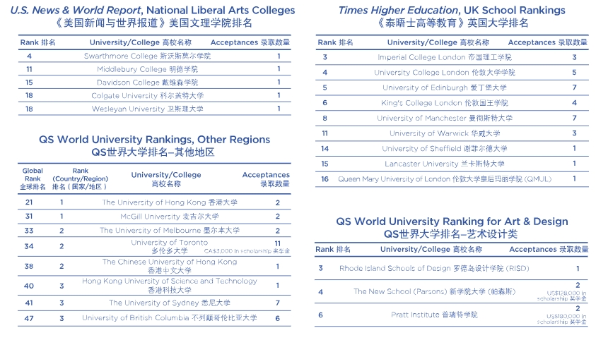 在今年的全球大学放榜季,除了美国、英国方向录取捷报频传,中国·贝赛思国际学校艺术与其他方向录取表现稳健,多点开花。8名申请艺术方向的学生,总共收到世界排名前5的艺术大学发来的12份录取通知书,包括伦敦艺术大学、新学院大学(原名“帕森斯设计学院”)和罗德岛设计学院。麦吉尔大学、多伦多大学、墨尔本大学、悉尼大学、香港大学等全球知名大学也纷纷伸来橄榄枝,显示对中国·贝赛思国际学校学生的高度认可。