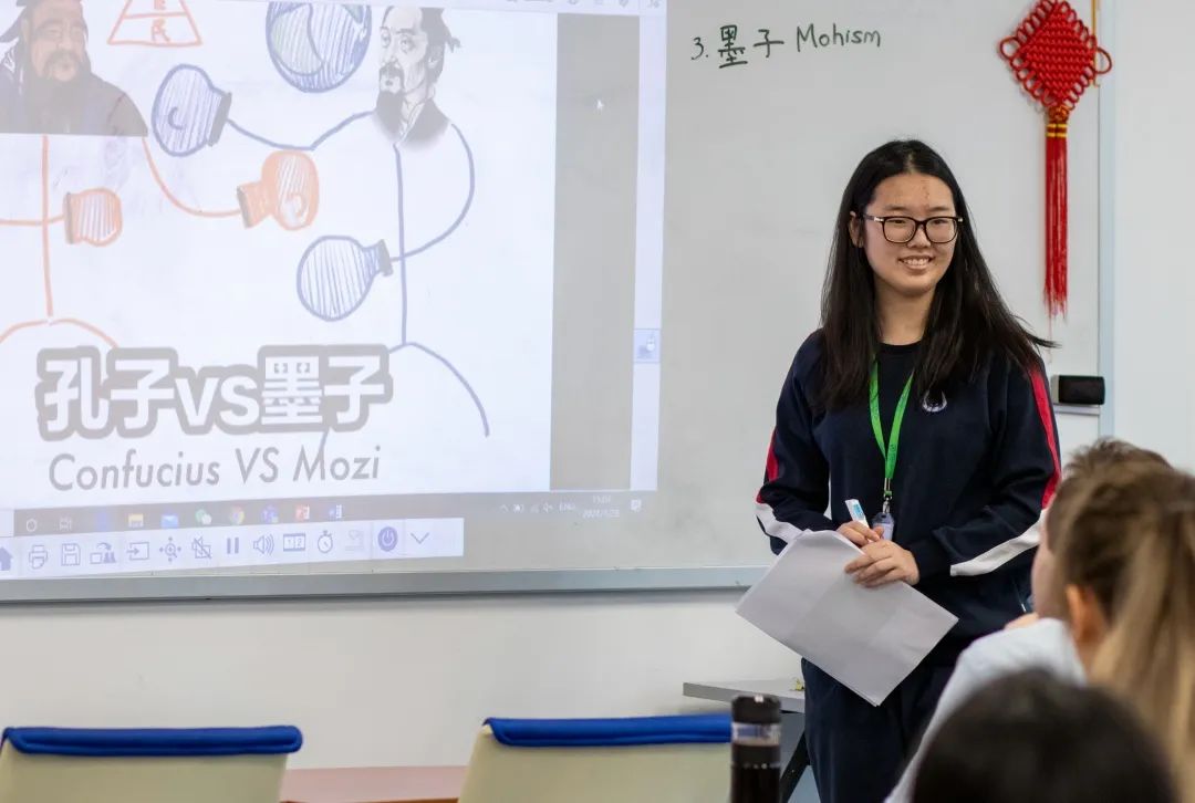 上周四,十一年级的同学们完成了一次特别的汇报——通过中英双语的形式向中外教师分享了对于先秦诸子百家的学习感悟。在汇报过程中,同学们以组为单位介绍了不同思想流派人物的经典语录、哲学思想以及艺术特征,部分小组将欧洲历史课程中学习到的古希腊哲学家与先秦诸子进行对比分析。同学们的思考与讨论给来自不同文化背景的老师们留下了深刻印象。