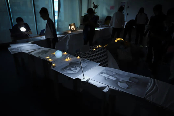 学生们需要在40分钟之内搭建好他们的互动装置,60分钟之内展示作品,因此他们必须从创新的视角和实操的层面来思考最大化利用空间、有限时间内吸引并留住观众、快捷拆卸装置的最佳方案。60分钟的展示结束后,教室恢复原状。虽然学生们没能在物理空间里留下艺术作品的痕迹,但他们独一无二的创作将始终存在于我们的想象之中。