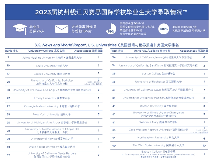 杭州钱江贝赛思国际学校今年迎来第二届毕业生,共有26人,收到了165份录取通知书,获得奖学金总额1,133,500美元,在藤校和英美顶尖大学等方向录取均有突破。除首次获得康奈尔大学的藤校录取之外,还斩获全美排名前10的约翰斯·霍普金斯大学和杜克大学、全美排名第1的文理学院——威廉姆斯学院的录取通知书。奖学金方面,一名学生获得加利福尼亚大学伯克利分校颁给本科新生最具盛名的校董和校长奖学金(The Regents' and Chancellor's Scholarship),金额高达140,000美元,难能可贵。在英国方向上,学校首次收获了剑桥大学的录取。