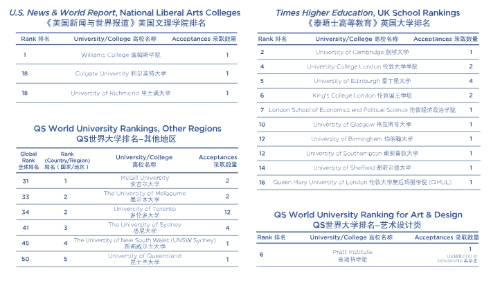 在今年的全球大学放榜季,除了美国、英国方向录取捷报频传,中国·贝赛思国际学校艺术与其他方向录取表现稳健,多点开花。8名申请艺术方向的学生,总共收到世界排名前5的艺术大学发来的12份录取通知书,包括伦敦艺术大学、新学院大学(原名“帕森斯设计学院”)和罗德岛设计学院。麦吉尔大学、多伦多大学、墨尔本大学、悉尼大学、香港大学等全球知名大学也纷纷伸来橄榄枝,显示对中国·贝赛思国际学校学生的高度认可。
