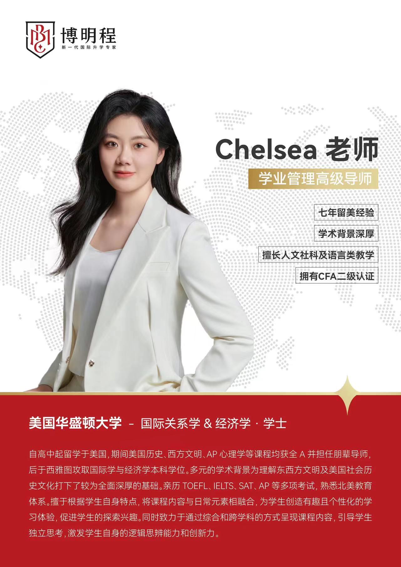 在教育的广阔天地中,有一位学业管理的高级导师,她就是Chelsea老师。拥有七年的留美经历,Chelsea老师不仅积累了深厚的学术背景,更在人文社科及语言类教学领域展现出卓越的能力。