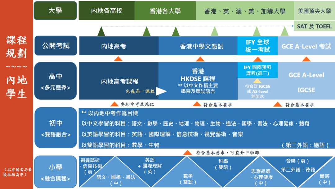 - 实施多轨制,将同时提供内地高考课程、香港中学文凭试(HKDSE)课程及IGCSE、GCE IAL、 NCUK IFY、SAT及TOEFL等国际课程。