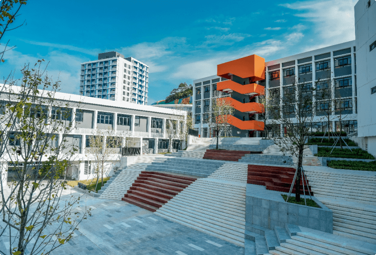 在四个校区中,环境最为优美宜人的当属惠贝。它坐落于风景秀丽的小径湾畔,整个校园巧妙地依山势而建,建筑错落有致,与自然景观和谐共融。校园占地广阔,面积高达68,744平方米,而总建筑面积也达到了43,356平方米。令人瞩目的是,它的容积率仅为0.59,建筑覆盖率更是低至22%,这意味着大部分的土地都被绿意盎然的植被所覆盖。事实上,绿地面积占比高达60%,使得惠贝成为了一座难得一见的生态型校园,为师生们营造了一个清新宁静的学习和生活环境。