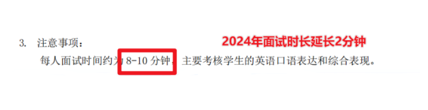 深国交2024年面试时长延长2分钟,每人约8-10分钟。此变化对考生影响不大,只需准备适量内容。