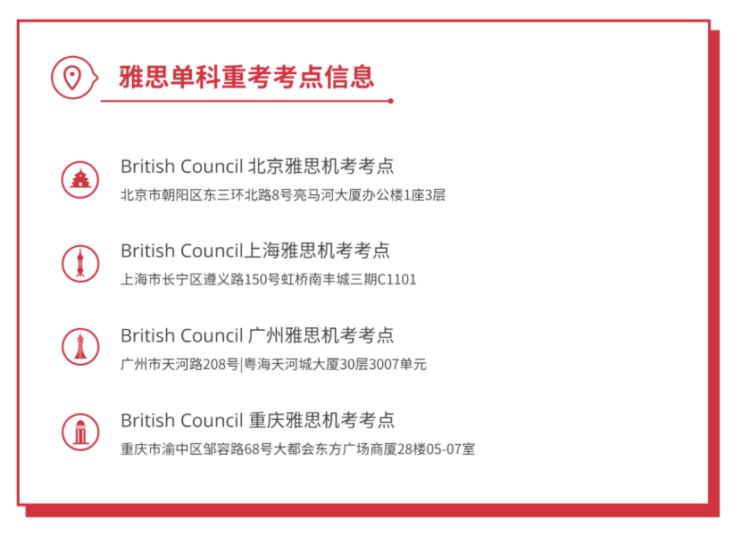 中国大陆地区的雅思机考考生迎来好消息!雅思机考单科重考将首先在北京、上海、广州和重庆这四个城市的英国文化教育协会办公室考点进行试点。考生们可以根据自己的实际情况和便利性,在这四个考点中自由选择参加雅思机考单科重考的地点。