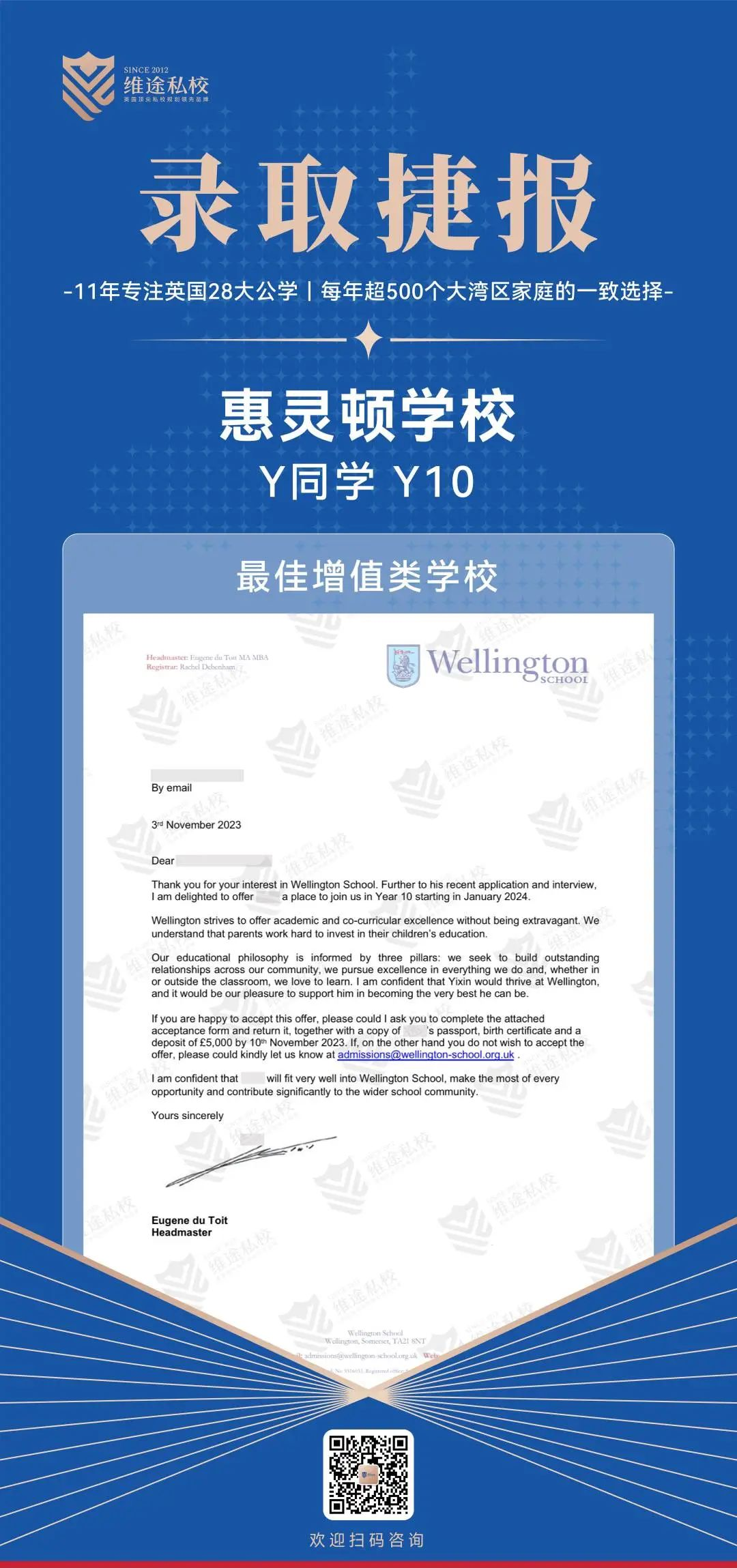经过三个月的密集训练和努力,Y同学终于在学术科目上取得了显著进步,并如愿以偿地收到了惠灵顿学校的录取通知书。