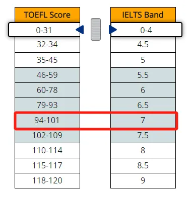 根据ETS官方数据,雅思7分对应托福分数94-101之间,雅思7.5分则在托福102-109之间。