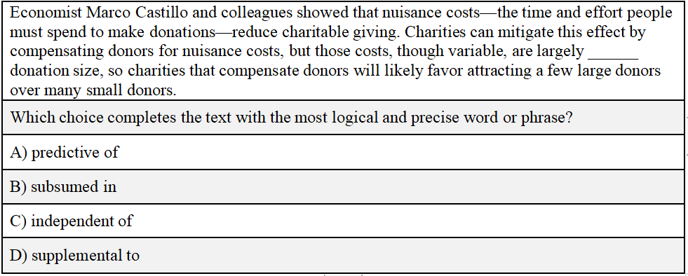 单词填空题的文本通常由1-2句话组成,虽然内容简短,但某些题目的选项词汇却颇具挑战性。这就要求考生不仅要有一定的词汇量积累,还需要通过理解这两句话之间的逻辑关系来准确作答,题目的问法固定:“Which choice completes the text with the most logical and precise word or phrase?”
