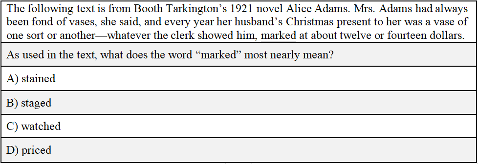 在SAT机考中,单词替换题与纸笔考试中的词汇题相似,但数量较少,仅占5%的比例。值得注意的是,这类题目仅在小说类短文中出现。题目的问法固定:“As used in the text, what does the word ‘***’ most nearly mean?”