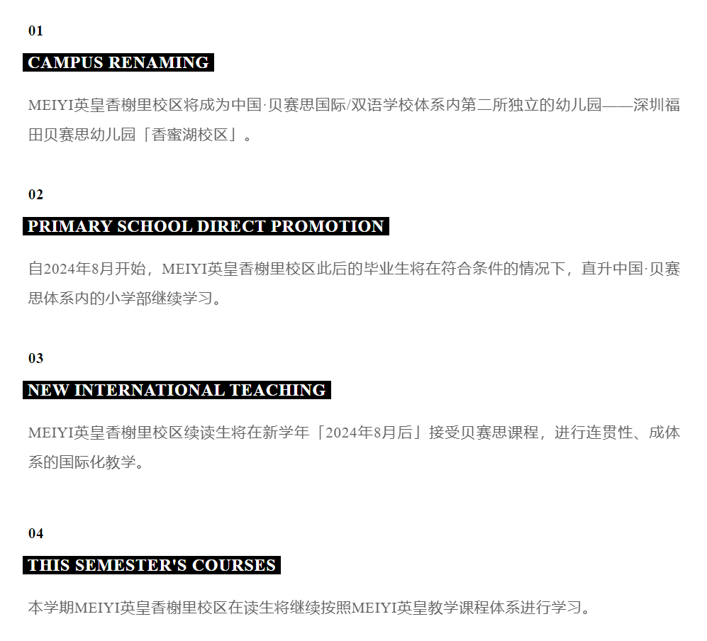 1、自2024年8月起,MEIYI英皇幼儿园的学子在完成学业后,将具备直接升入贝赛思其他校区小学部的资格,但本暑期毕业的学生可能错失这一机会。