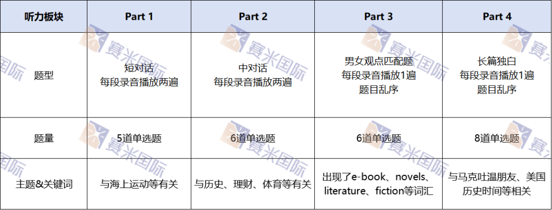 听力测试由四个部分组成:短对话、中对话、男女观点匹配以及长篇独白。整体难度略高,尤其是后两部分,题目顺序打乱,且录音只播放一遍,对学生的听力技巧和反应能力提出了较高要求。