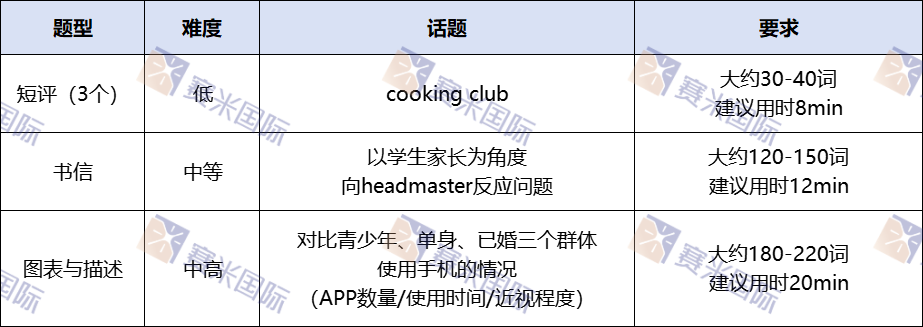 写作环节包含三个小题:短评、书信和图表写作。题目内容围绕食物、烹饪、学校生活、手机使用等日常主题。这要求学生不仅要有扎实的写作技巧,还需有丰富的词汇储备和广泛的话题知识。考生表示,通过之前的针对性训练,他们已经熟练掌握了各种题型的应答技巧,并能在规定时间内完成作答~