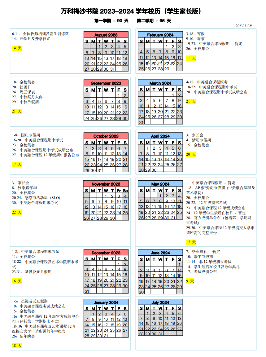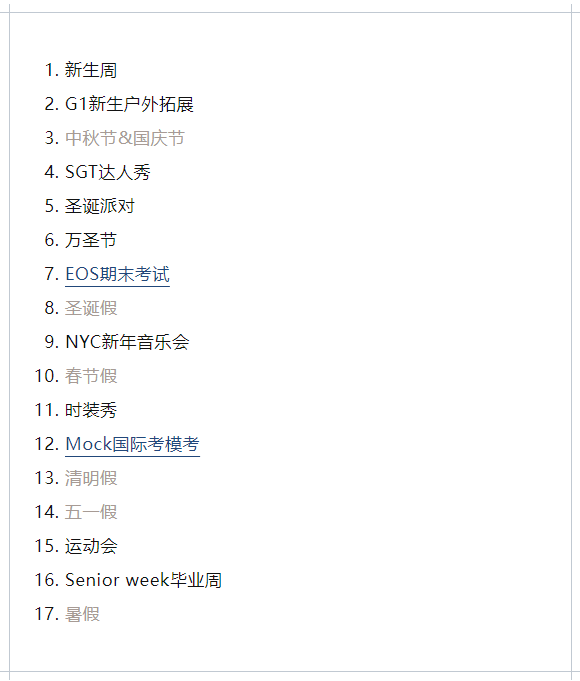 灰色为假期,标黄的是学校比较重要的日期。