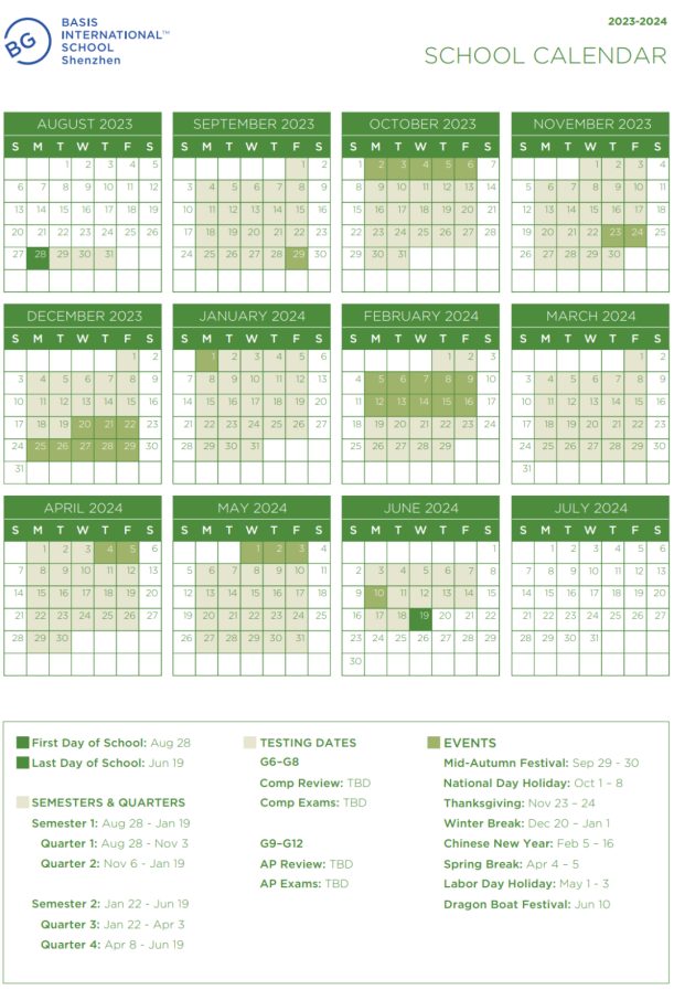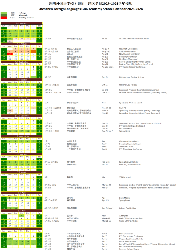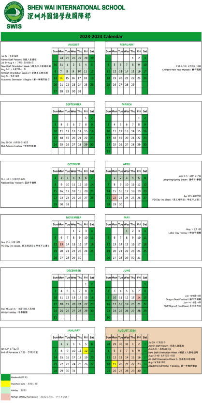 深外国际部新的校历只标明上课时间、假期以及重点日子,比较简要。浅绿色标示的是假期,而标黄的日期则是学校较为重要的日子。