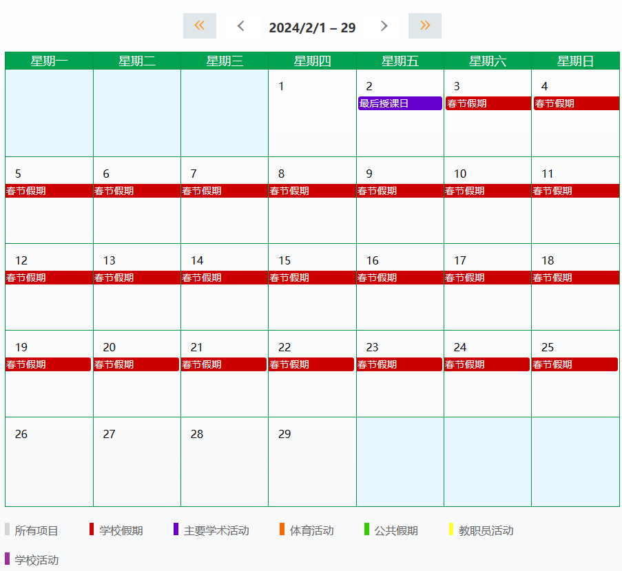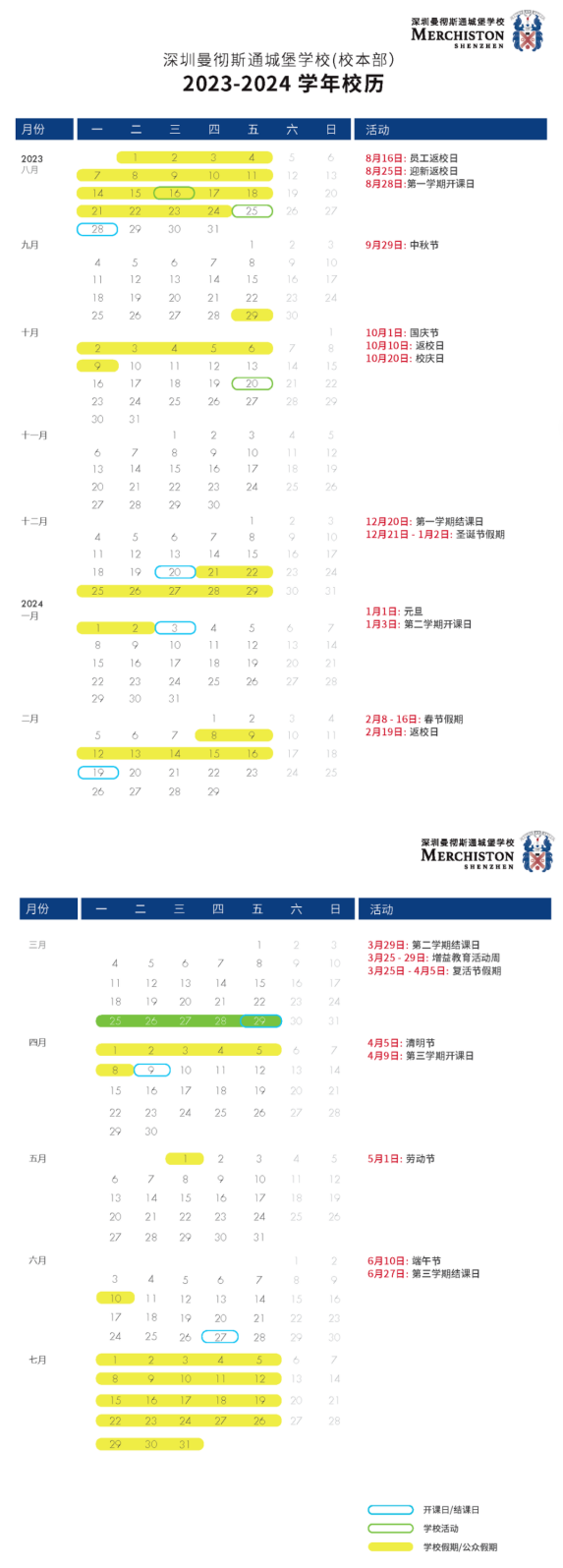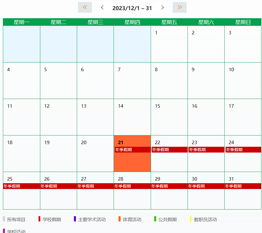黄色为学校假期,绿色为学校活动日。
